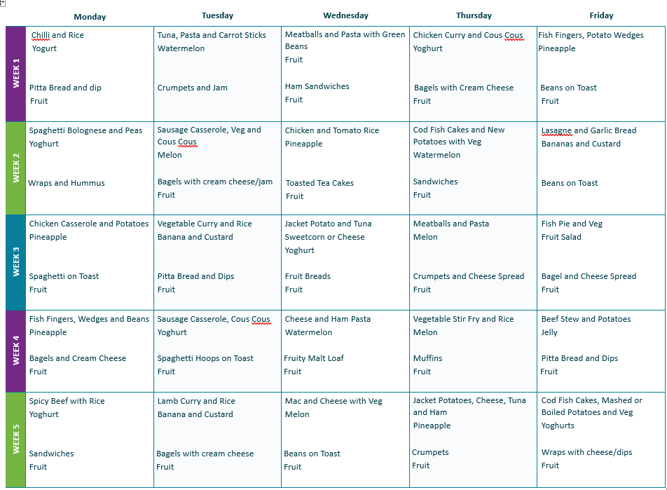 Mealtimes are an important time at the Nursery and our children enjoy sitting down together, serving their own food, helping others and enjoying the social element of a meal with friends. We offer a varied menu, with vegetarian option, which is on a five week rotation, detailed below: