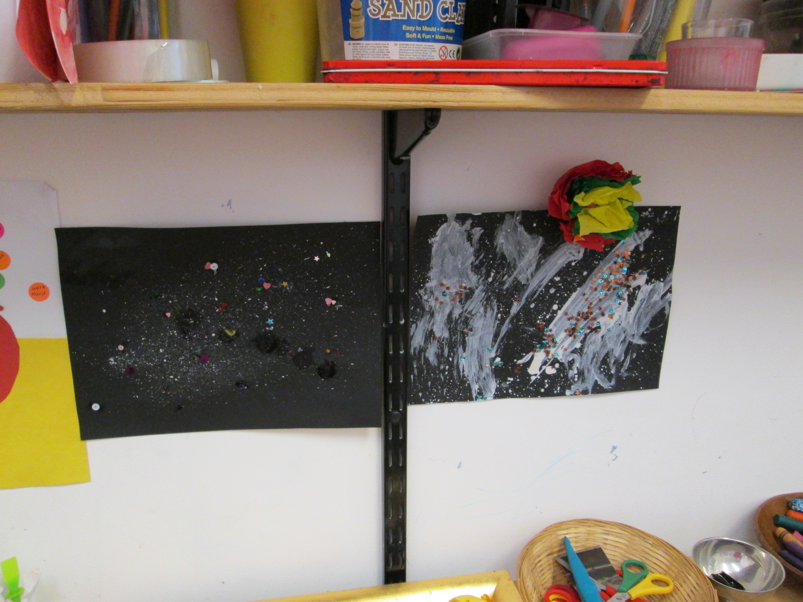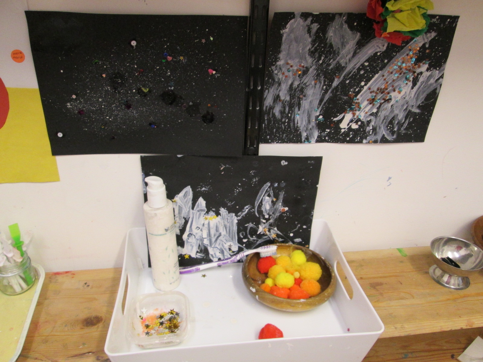 Following our Biome theme into outer space, the children have been using stars, sequins and spattering white paint (paint and toothbrushes) onto black card. The children have also been using poms poms to signify the planets.